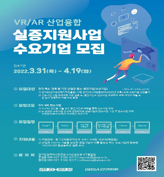 | °æ±âµµ°¡ °¡»ó/Áõ°Çö½Ç(VR/AR) ±â¼ú Ȱ¿ëÀ» ¿øÇÏ´Â Á¦Á¶¡¤°ÇÃà °ü·Ã »ê¾÷±º¿¡ ¼ÓÇÑ Áß¼Ò․Áß°ß±â¾÷À» ¿À´Â 19ÀϱîÁö ¸ðÁýÇÑ´Ù.°æ±âµµ´Â °¡»ó/Áõ°Çö½Ç ±â¼ú±â¾÷°ú ÀÌ.. |